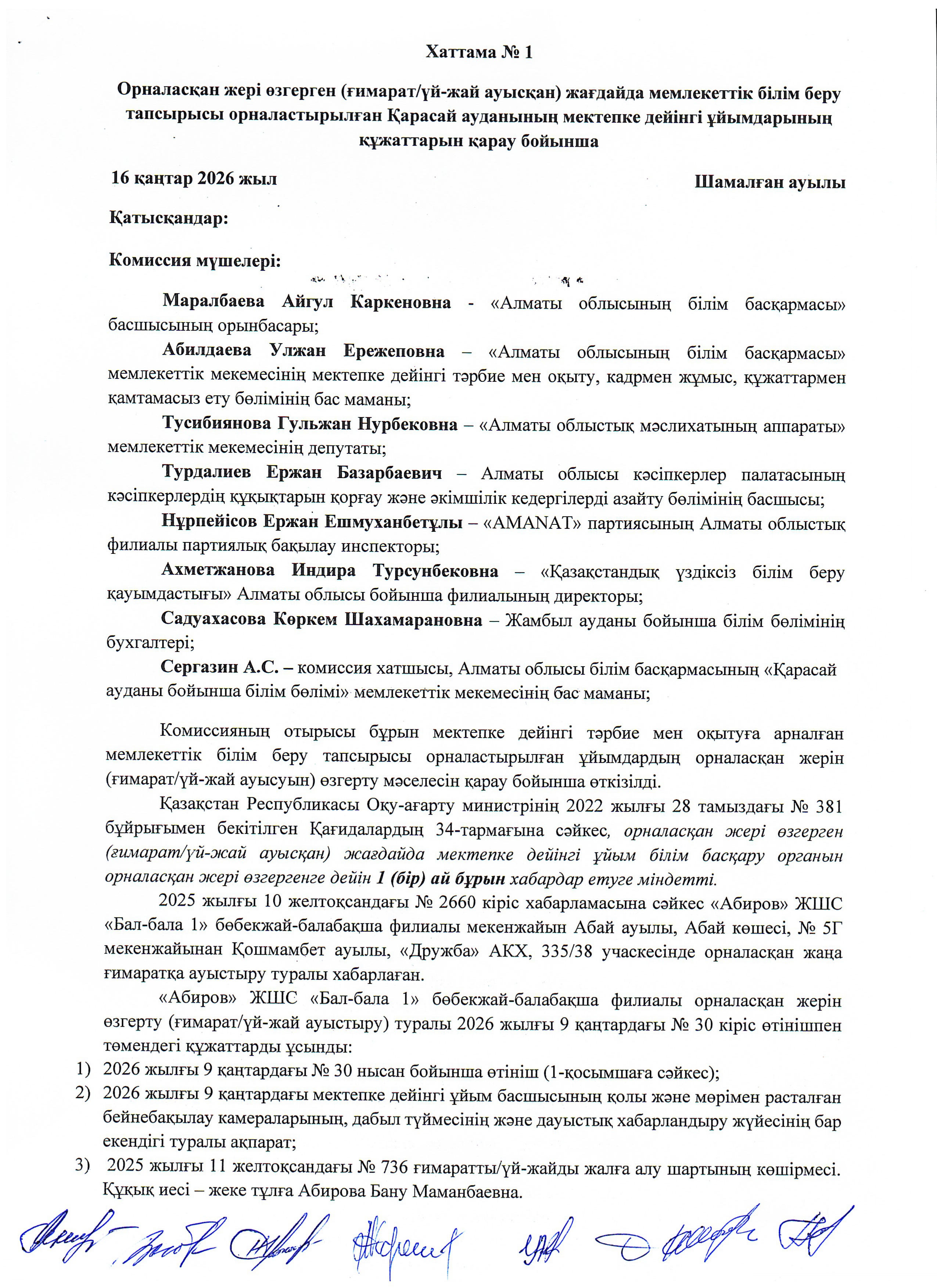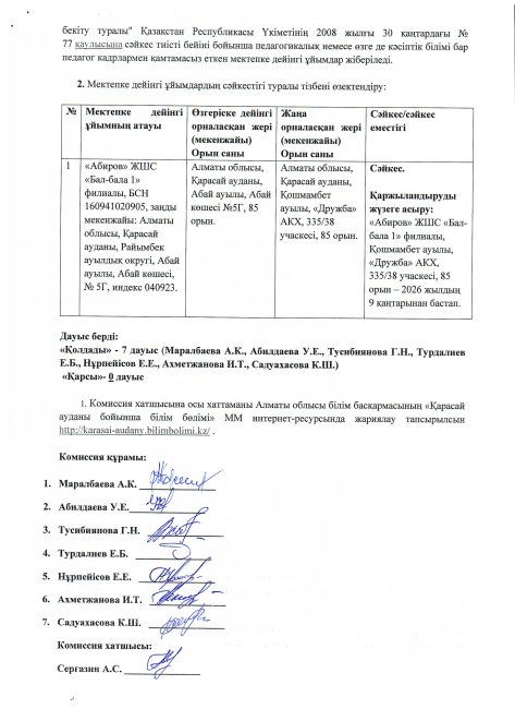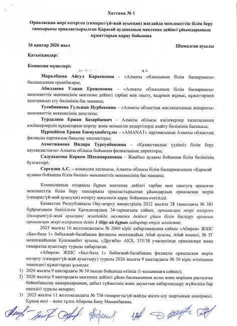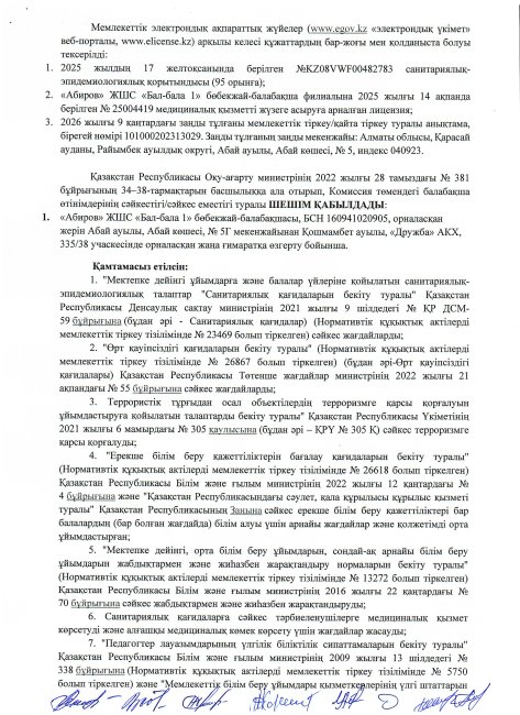 Осы талапты басшылыққа ала отырып, 2025 жылғы 10 желтоқсандағы «Абиров» ЖШС филиалы «Бал-бала 1» балабақшасының № 2660 кіріс хабарламасына және 2026 жылғы 09 қаңтардағы № 30 кіріс өтінішіне сәйкес тиісті құжаттар білім бөліміне ұсынылды. Қазақстан Республикасы Оқу-ағарту министрінің 2022 жылғы 28 тамыздағы № 381 бұйрығының 35–38-тармақтарын басшылыққа ала отырып, ұсынылған құжаттарды қарау нәтижелері бойынша Комиссия “Абиров”ЖШС филиалы “Бал-бала 1” балабақшасы осы Қағидалардың талаптарына сәйкестігі туралы ШЕШІМ ҚАБЫЛДАДЫ.