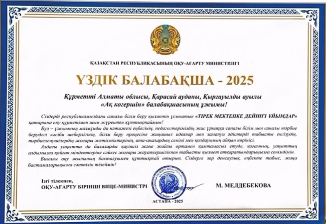 “Ақ көгершін” балабақшасының ұжымын “Үздік балабақша – 2025” марапатын иеленуімен шын жүректен құттықтаймыз!