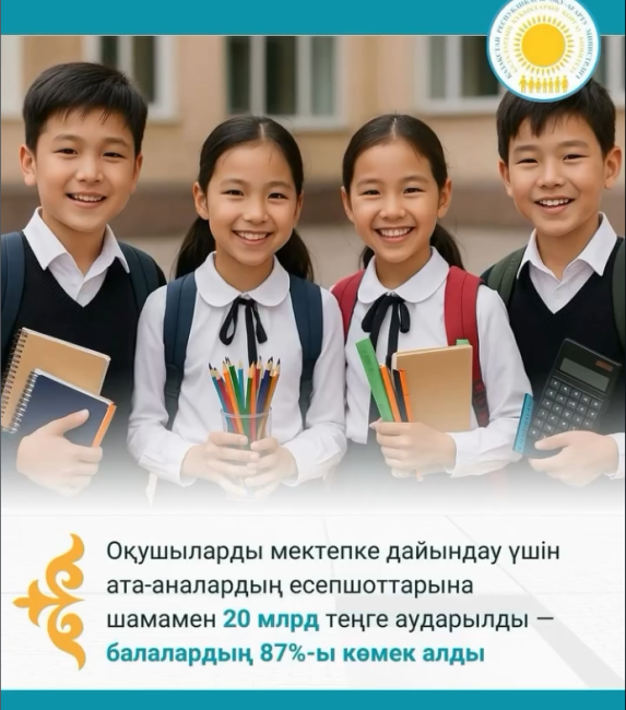 📌 «Жалпыға бірдей білім беру» қоры аясында ата-аналардың және заңды өкілдердің есепшоттарына мектеп формасын, аяқ киім мен оқу-құралдарын сатып алу үшін шамамен 20 млрд теңге аударылды. Қолдау 430 мыңнан астам баланы қамтыды, бұл жалпы алушылар санының 87%-ына жуық.
